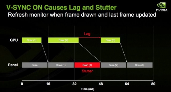 이를 이용하면, 확실히 주사율과 프레임이 일치하면서 테어링 현상은 많이 줄어듭니다. 단지, 그 반대급부로 프레임을 출력에 미세한 지연이 발생하게 되면, 다음 프레임을 출력할 때는 약간의 대기 시간을 가지게 됩니다. 이때 순간적으로 프레임이 떨어지면서 화면이 끊겨 보이는 ‘스터터링’이 발생하죠.