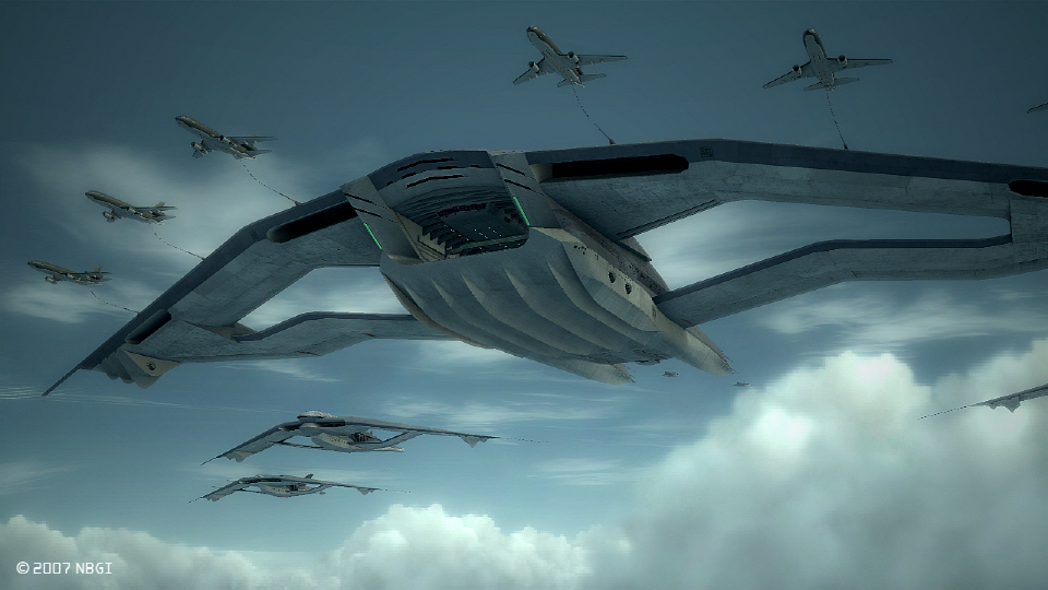 현실적인 비행 시뮬레이션과는 정말 거리가 먼 부분은 1편에서 모두 나옵니다. 협곡 사이를 절묘하게 비행한다거나, 현실에 존재하지 않는 거대 비행기가 보스라거나 하는 것들 말이죠. 이 모든 것은 철저하게 흥미 위주로 만들어진 에이스 컴뱃의 정체성을 대표하는 것으로, 이후 이 게임 시리즈가 갈 방향을 1편부터 제시하고 있었습니다.