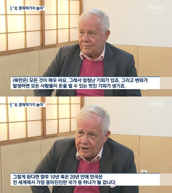 또 짐 로저스는 북한이 개방되면 좋은 노동력과 풍부한 천연자원, 철도가 곁들여져 한국에도 많은 이익을 가져다줄 것이라고 전망했다.