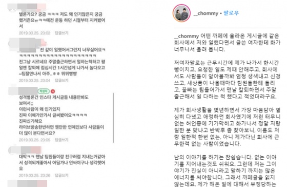 춈미는 26일 자신의 인스타그램에 "어떤 카페에 올라온 게시글에 같은 회사에서 저와 일했다면서 글 쓴 여자한테 화가 너무 나서 올려 본다"며 한 네티즌의 댓글을 캡처해 올렸다.