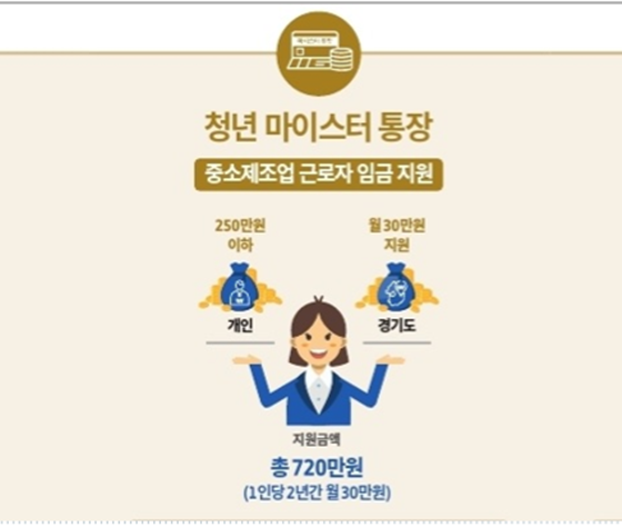 청년마이스터 통장이란 경기도 내 중소 제조기업에 재직하며 3개월 평균 건강보험료 8만750원 이하인 만 18~34세인 경기도 거주자에게 매월 30만 원씩 2년간 1인당 최대 720만원을 지급하는 제도다.