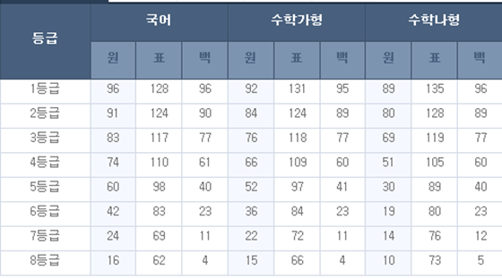국어의 1등급 컷은 모든 입시 업체들이 96점을 1등급 컷으로 예상했다. 이어 2등급은 90~91점 사이, 3등급은 82~83점 선에서 나타날 것으로 예측됐다.