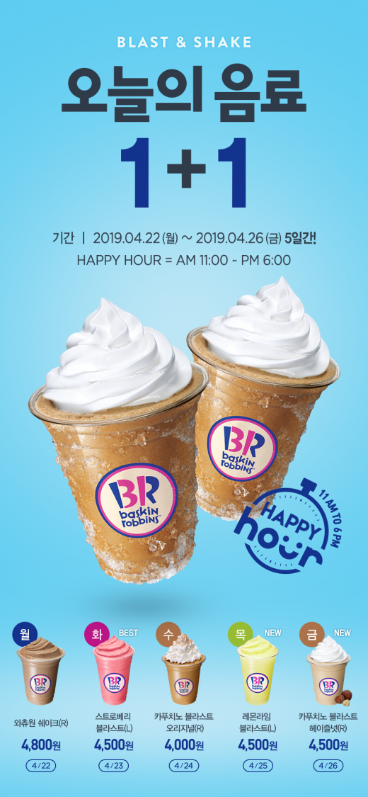 배스킨라빈스가 '해피아워! 오늘의 음료 1+1' 프로모션을 진행한다.