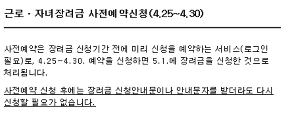이어 국세청 홈택스 홈페이지는 사전예약 신청 후 장려금 신청 안내문이나 안내 문자를 받아도 다시 신청할 필요가 없다고 고지했다.
