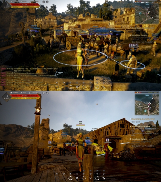 퀘스트 장소까지의 이동 등 동선과 위치 등은 월드맵, 그리고 필드맵에서의 경로표시 등을 활용하면 큰 문제 없을 정도로 편의성도 좋습니다. 나중에는 말 등의 탈것이 주어지겠지만, 무작정 뛰어야만 하는 초반에도 일일이 스틱을 기울이고 있지 않아도 스틱 버튼 한번으로 자동 뛰기, 왼쪽 트리거를 누르면 스프린트 등을 지원합니다. 오른쪽 스틱으로 이동방향만 슥슥 조정해 주면 됩니다.