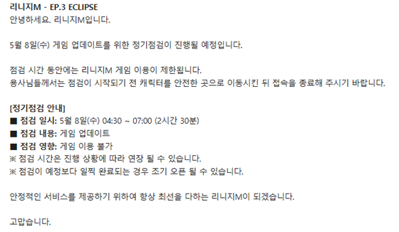 리니지m은 지난 7일 공지사항을 통해 "안녕하세요. 리니지m입니다. 5월 8일 게임 업데이트를 위한 정기점검이 진행될 예정입니다"라고 알렸다.