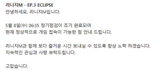 리니지m 측은 8일 공지사항을 통해 "안녕하세요. 리니지m입니다. 5월 8일 오전 6시 35분 정기점검이 조기 완료되어 현재 정상적으로 게임 접속이 가능한 점 안내드립니다"라고 알렸다.