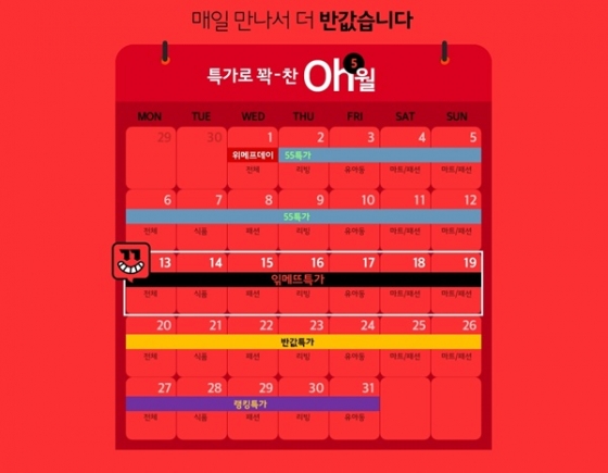 공개된 달력을 살펴보면 지난 2일부터 지난 12일 까지는 55특가'가 진행됐으며 지난 13일부터 오는 19일 까지는 '읶메뜨특가' 주다. 마지막 주인 오는 20일 부터는 '반값특가' 이벤트를 진행한다.