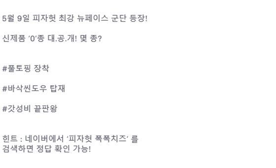 이어 '풀토핑 장착, 바삭씬도우 탑재, 갓성비 끝판왕'이라는 해시태그를 단 뒤 '피자헛 폭폭치즈'를 검색하면 정답을 확인할 수 있다고 덧붙였다.