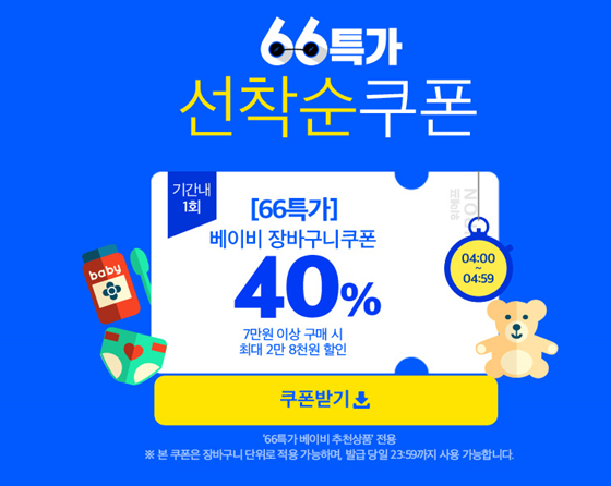 위메프 측은 4일 66특가 베이비 상품을 특가에 판매한다고 전했다. 먼저 66특가는 선착순으로 기간 내 1회 사용이 가능한 베이비 장바구니 40% 쿠폰을 발행한다.