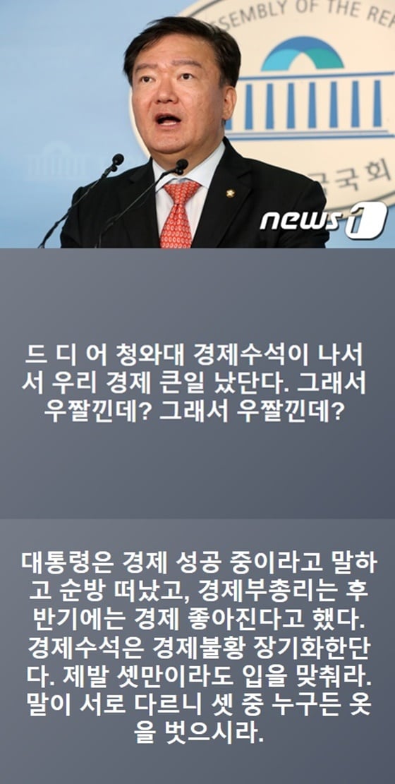 이어 민경욱 대변인은 "대통령은 경제 성공 중이라고 말하고 순방 떠났고 경제부총리는 후반기에는 경제 좋아진다고 했다. 경제수석은 경제 불황 장기화한단다. 제발 셋 만이라도 입을 맞춰라. 말이 서로 다르니 셋 중 누구든 옷을 벗으시라"라고 또 다른 게시물을 올렸다.