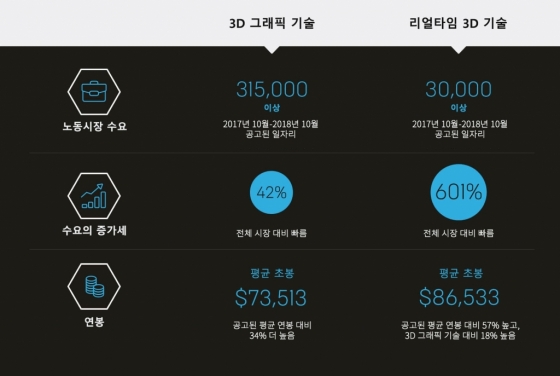 3D 그래픽 기술 직종 중에서도 특히 리얼타임 3D 기술과 관련된 일자리의 증가세가 눈에 띄게 높았는데, 일자리는 30,000개가 넘는 것으로 나타났으며, 일자리 증가세는 전체 시장 대비 601%라는 압도적인 수치를 보였다. 평균 초봉 역시 약 86,000달러(한화 약 1억 2백만원)로, 공고된 평균 연봉 대비 57%, 일반적인 3D 그래픽 직종보다는 18% 더 높았다.