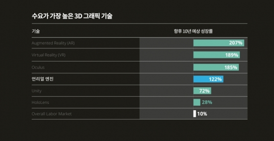 리얼타임 게임엔진의 대표 격인 언리얼 엔진은 AR과 VR, 오큘러스 리프트와 함께 리얼타임 3D 그래픽 기술을 배우고자 하는 사람들에게 가장 수요가 높은 기술 중 하나로 조사됐는데, 언리얼 엔진과 관련된 일자리는 향후 10년간 122% 이상 성장할 것으로 전망된다.