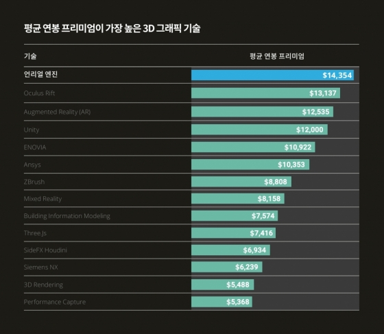 또한, 언리얼 엔진 기술을 필요로 하는 직업은 3D 그래픽 분야 중에서도 연봉이 높은 리얼타임 3D 기술직군 중 가장 많은 연봉을 받는 것으로 나타났다. 언리얼 엔진을 다루는 기술이 요구되는 직무의 평균 연봉은 그렇지 않은 직무의 평균 연봉보다 14,354달러(한화 약 1천 7백만원)가 높았으며, 언리얼 엔진을 능숙하게 다루는 아티스트와 프로그래머, 디자이너는 연봉에 있어서 각각 51%와 22%, 5%를 더 받는 것으로 조사됐다.