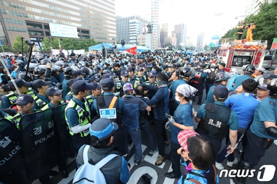 서울시는 25일 오전 불법으로 설치된 대한애국당의 천막을 철거하기 위해 시도 중이다. 이에 철거 작업에 투입된 인원들은 대한애국당 당원들과 대립을 펼치고 있다.
