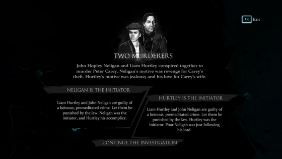 역행 인지와 자료 수집으로 퍼즐을 하나씩 짜맞춘 후 마인드 팰리스에서 사건의 흩어진 요소들을 이어나가 최종 결론에 도달하면 범죄의 윤곽이 드러납니다. 여기서 범인에게 냉정한 법의 심판을 받도록 놔두느냐, 아니면 자비를 베푸느냐 하는 선택은 게이머의 몫입니다. 일단 게임 초반 사건들은 범인의 의지와는 상관 없이, 어떤 힘에 의해 일어난 환각으로 우발적으로 저지른 범죄들이므로 자비를 베풀 여지가 있을 겁니다.