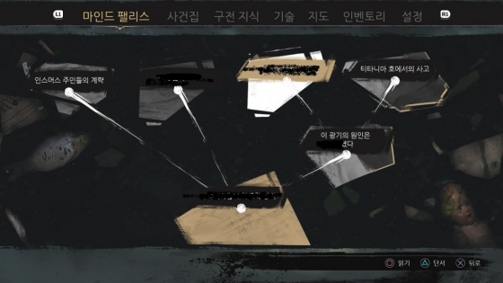 하지만 그것보다는 오히려 게임의 UI나 정렬방식 등의 문제가 더 두드러졌습니다. 해결된 퀘스트에 메인과 서브가 그냥 해결된 순서대로 쌓여있어 직관적으로 보기가 힘들고, 사건집에 점차 쌓이는 단서들도 어떤 인과관계 없이 나열될 뿐입니다.