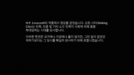 생전 지독한 인종차별주의자로, 작품 곳곳에 유색인종에 대한 모멸적인 표현이 잔뜩 들어가 있는 것으로도 악평이 자자한 러브크래프트의 세계관으로 만든 게임이라, 게임 시작 시에 당시 배경인 1920년대의 세계에서 흔히 있었던 사실을 없애지 않고 당시를 정확하게 묘사한 것이니 게임 유저들의 이해를 바란다는 개발진의 메시지와 함께 이 ‘위태로운’ 게임은 시작됩니다.