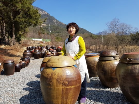 충청북도 제천 청풍호수 인근에 위치한 송화약두장의 안선미 장류발효명인이 장독을 확인하고 있다. /사진제공=한국장류발효인협회