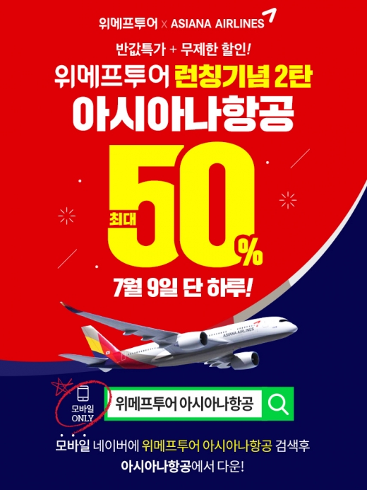 위메프는 9일 '투어위크' 아시아나항공 할인 프로모션을 진행한다고 밝혔다.