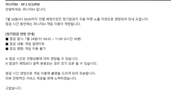 이에 대해 리니지m 측은 "정기점검이 구글 마켓 노출 지연으로 연장되어 안내드립니다. 점검 시간 동안에는 리니지m 게임 이용이 제한됩니다"라고 설명했다.