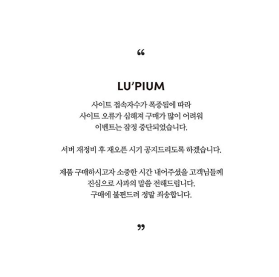 루피움은 24일 공식 인스타그램을 통해 "안녕하세요. 루피움입니다. 먼저 죄송하다는 말씀드립니다. 사이트 접속자 수가 폭증하게 되면서 사이트 오류가 심해져 기다리셨던 1+1 이벤트는 잠정 중단하기로 하였습니다"라고 밝혔다.