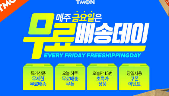 티몬은 '매주 금요일은 무료배송데이'라는 글을 게재했다. 이날 '무료배송데이'에서는 특가 상품 무제한 무료배송, 오늘 하루 무료 배송 쿠폰 제공, 오늘만 15번 초특가 상품, 당일 사용 쿠폰 이벤트를 벌인다.