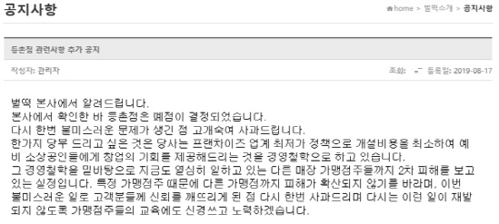 이후 논란이 커지자 등촌점 점주는 지난 17일 자신의 SNS를 통해 "아무 생각 없이 글을 올린 데 대해 정말 죄송하다. 친구들과 시작된 장난이 이렇게 큰일을 초래할 줄 생각지도 못했다"며 "제 생각이 정말 짧았다. 손님들에게 너무 죄송하고, 본사 및 다른 지역 벌떡 점주님들에게도 죄송하다"고 사과문을 게재했다.