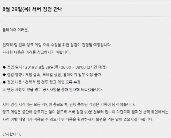 따라서 서버 점검 90분 전부터 접속이 차단되며 챔피언 선택 화면에서 사전 이탈 패널티가 적용될 수 있다.
