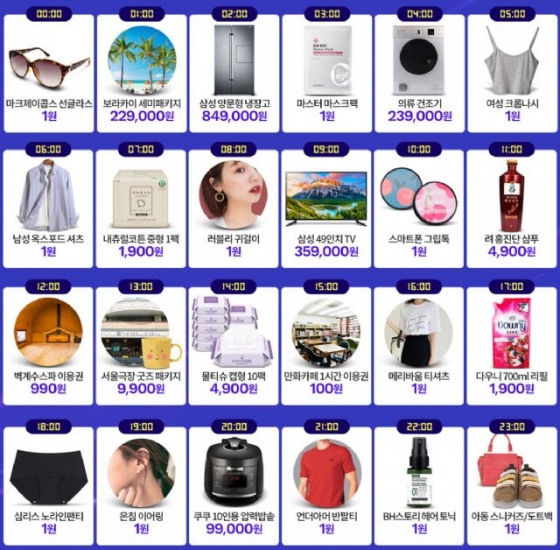 자정인 0시 ▲보라카이 라까멜라 3박5일 세미패키지(180매, 9~10월 출발) 22만9천원 판매를 시작으로, 새벽 4시 ▲스위스밀리터리 의류건조기(7kg, 50대) 23만9천원, 아침 9시 ▲삼성전자 49인치 TV(30대)를 35만9천원에 판매한다.