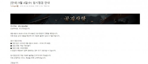 정기 점검 중에는 게임 이용이 불가하며, 점검이 예정보다 일찍 완료될 경우 조기 오픈될 수 있다.