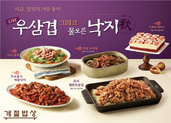 계절밥상은 가을 신메뉴 테마 지금 절정의 가을 풍미, 라이브 우삼겹 그리고 물오른 낙지에 맞춰 철판에 굽는 '라이브 코너'를 강화하고 맛과 영양이 오른 가을 먹거리인 낙지, 무화과 등을 활용한 요리 10여 종을 출시했다.
