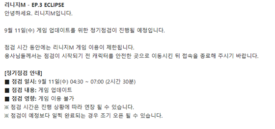 리니지M은 지난 10일 공지사항을 통해 11일 오전 4시 30분부터 7시까지 총 2시간 30분동안 정기 점검을 실시한다고 밝혔다.