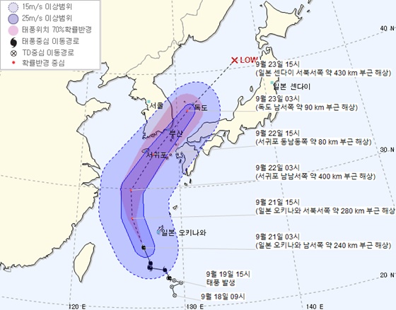 22일 오후 3시경에는 서귀포 동남동쪾 약 80km 부근 해상에 도달할 것으로 전망되며, 23일 독도 남서쪽 약 90km 부근 해상을 지나 일본 센다이로 북동할 것으로 예측된다.