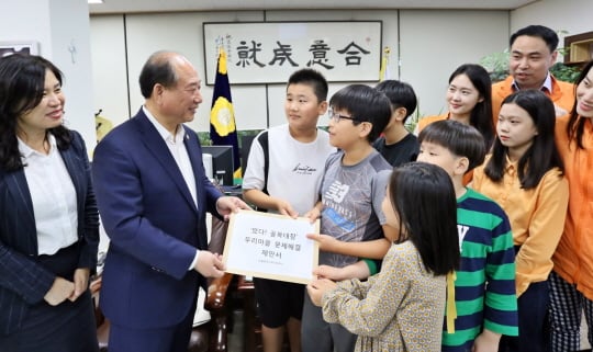 한화갤러리아 사회공헌활동 ‘희망트레이너’ 참여 어린이들이 24일 아동권리를 수호하기 위한 지역 사회의 문제점 개선을 적은 제안서를 영등포구의회 윤준용 의장에게 전달하고 있다/사진제공=갤러리아