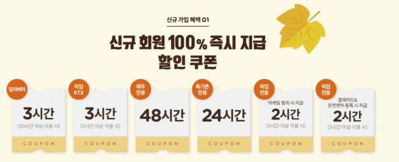 딜카 홈페이지와 어플을 통해 신규 회원가입 시 3시간, 48시간, 24시간, 2시간 등 다양한 쿠폰팩을 100% 증정한다.