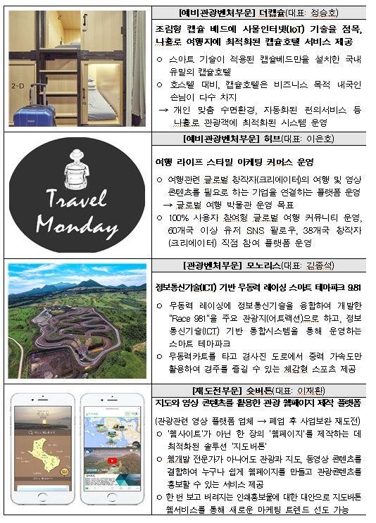 구체적 사업 내용을 보면 △예비관광벤처에는 ‘사물인터넷(IoT) 스마트 시스템을 적용한 개인 맞춤형 캡슐호텔’, ‘창작자(크리에이터) 활용 여행 영상 유통 플랫폼’, 등이, △관광벤처에는 ‘정보통신기술(ICT) 기반 무동력 레이싱 테마파크’, ‘창의적인 야간 관광체험 제공’ 사업 등이, △재도전벤처에는 ‘지도와 영상 콘텐츠 활용 관광 웹페이지 제작 플랫폼’, ‘무슬림 관광객을 위한 할랄 한식’ 사업 등이 포함됐다.