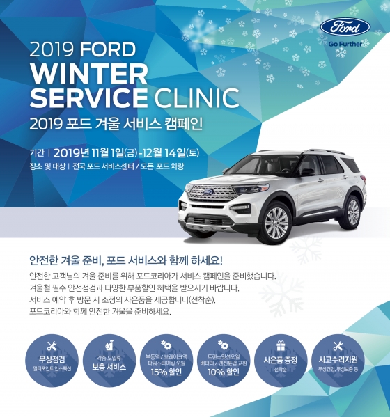 포드세일즈서비스코리아(대표이사 정재희, 이하 포드코리아)가 포드·링컨 전 차종을 대상으로 '2019 겨울 서비스 캠페인'을 진행한다고 밝혔다.