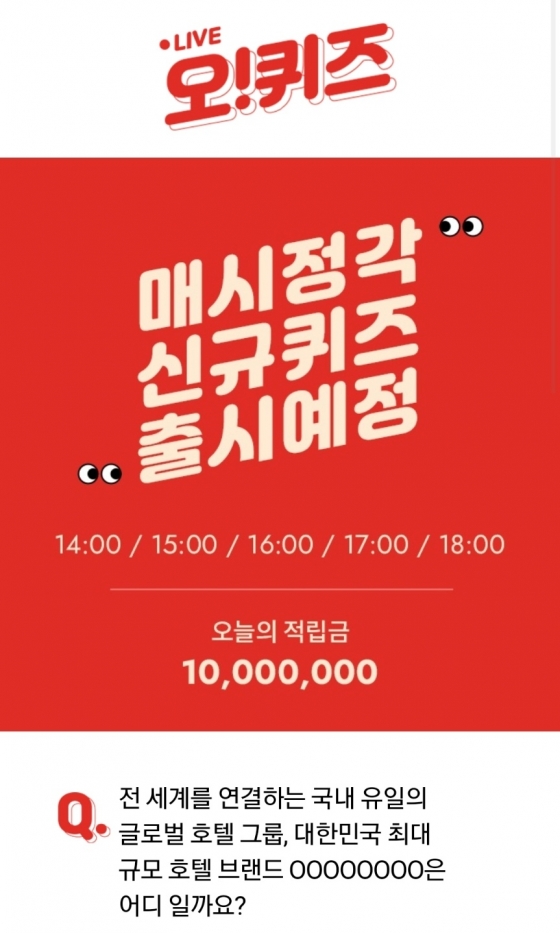이번 오퀴즈 롯데호텔특급세일의 오후 2시 퀴즈는 "전 세계를 연결하는 국내 유일의 글로벌 호텔 그룹, 대한민국 최대 규모 호텔 브랜드 OOOOOOOO은 어디일까요?"로 문장 속 빈칸에 알맞은 단어를 맞추면 된다.