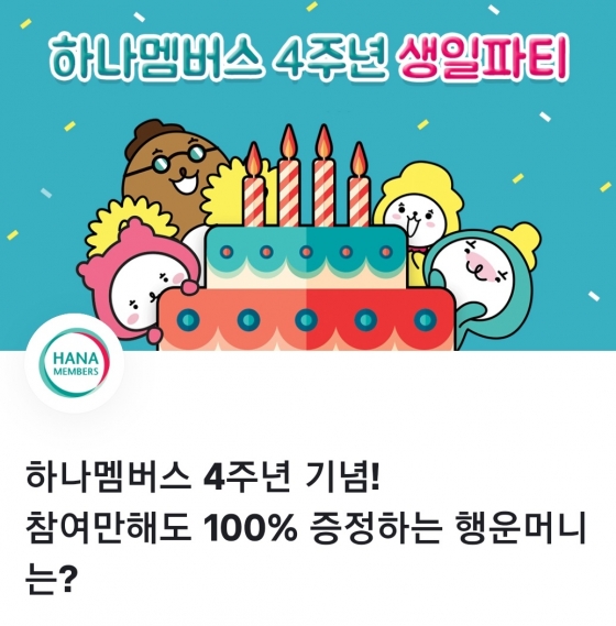 한편 하나멤버스는 4주년을 맞아 특별한 이벤트를 개최한다. 최대 100만원 행운머니, RP 연 5% 상품 등이 선물로 준비되어 있다.