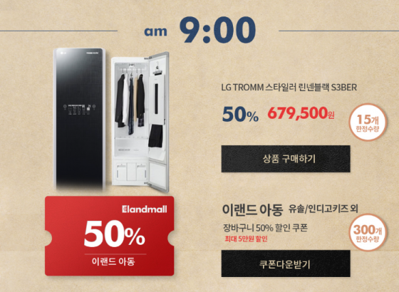 오전 9시부터는 ▲LG TROMM 스타일러 린넨블랙 S3BER ▲유솔/인디고키즈 외 이랜드 아동 장바구니 50% 할인 쿠폰이 각각 15개와 300개의 한정 수량으로 제공된다.