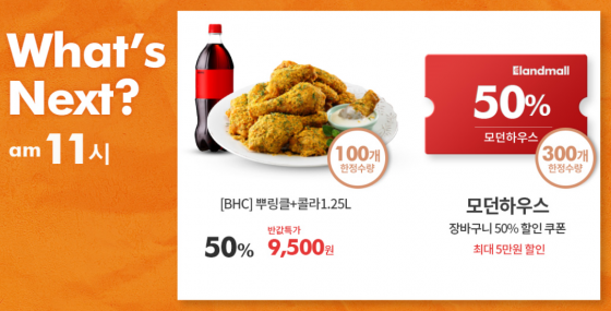 또한 오전 11시부터는 ▲[BHC] 뿌링클+콜라1.25L ▲모던하우스 장바구니 50% 할인 쿠폰이 각각 선착순 100개와 300개씩 제공될 예정이다.