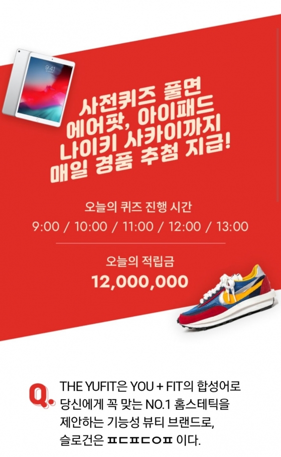 이번 의 오전 9시 사전 퀴즈는 "THE YUGIT은 YOU+FIT의 합성어로 당신에게 꼭 맞는 NO.1 홈스테틱을 제안하는 기능성 뷰티 브랜드로, 슬로건은 'ㅍㄷㅍㄷㅇㅍ'이다'로 문장 속 빈칸에 알맞은 단어를 맞추면 된다.