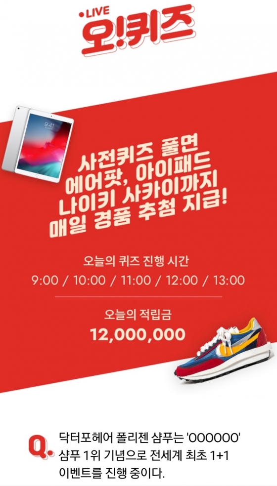 이번 오퀴즈 LG그램 이벤트의 오전 9시 사전 퀴즈는 "닥터포헤어 폴리젠 샴푸는 'OOOOOO' 샴푸 1위 기념으로 전세계 최초 1+1 이벤트를 진행 중이다"로 문장 속 빈칸에 알맞은 단어를 맞추면 된다.