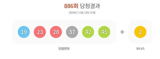 1등 당첨 번호는 19번, 23번, 28번, 37번, 42번, 45번이다. 2등 보너스 볼은 2번이다.