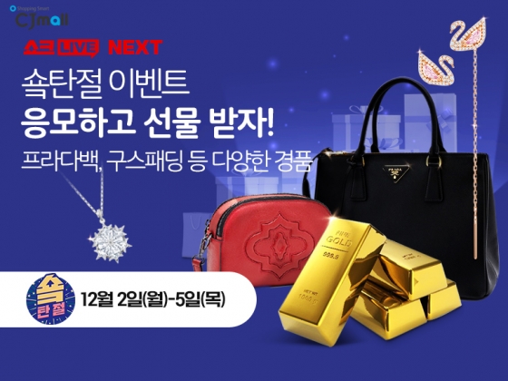 CJmall 쇼크라이브는 개국 2주년을 기념해 2일부터 오는 5일까지 4일간 '숔탄절' 이벤트 주간을 진행한다. <겟꿀쇼>, <뻔펀>, <픽미업>, <인싸쇼핑> 4개 생방송 프로그램에선 크리스마스 시즌을 맞아 선물이나 홈파티 등에 어울릴 상품을 편성하고, 각 상품마다 1명씩 추첨해 선물을 제공하는 이벤트를 진행한다. CJmall 쇼크라이브 '숔탄절' 이벤트 페이지에서 프로그램 별 편성 상품에 응모하면 된다. 순금 바, 풀빌라 2박 숙박권, 명품 가방, 홍천 1등급 한우 등이 준비돼 있으며, 고객 한 명 당 매일 4회 참여할 수 있다.