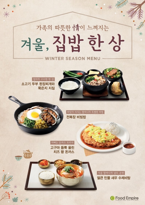 아워홈은 자사 컨세션 브랜드 푸드엠파이어에서 ‘겨울 집밥 한상’을 콘셉트로 겨울 시즌 메뉴 4종을 출시하고 연말 고객 사은 이벤트를 진행한다고 6일 밝혔다.