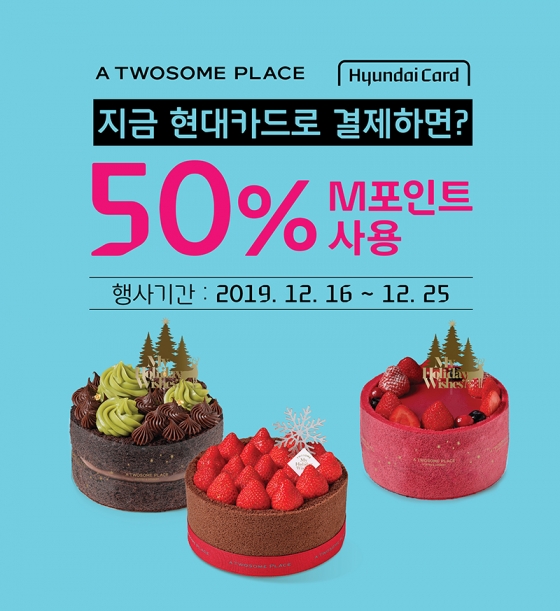 투썸플레이스 관계자는 "크리스마스면 빠질 수 없는 달콤한 케이크와 홈 파티 MD 등을 현대카드 M포인트 50% 사용 혜택을 받아 구매하시고 즐거운 연말 분위기를 한껏 즐기시길 바란다”라고 말했다.
