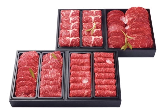 강진맥우 명품 1호(1,000,000원)는 갤러리아 독점 한우 브랜드 강진맥우의 대표 인기 선물세트로 다양한 부위 및 용도로 구성이 되어 보다 간편하게 이용할 수 있다. 총 4단 구성으로 등심 1.2kg, 꽃등심살 및 살치살 각 0.6kg, 채끝 및 알등심 각 0.6kg, 등심스테이크 및 안심스테이크 각 0.6kg으로 구성했다.