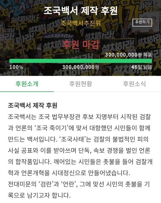 조국백서추진위는 지난 11일 "예상치 못한 뜨거운 참여로 나흘만에 모금을 마감하게 되었다"며 "조국백서 제작에 대한 시민들의 관심과 참여의지가 매우 높았다는 것을 실감했다. 더욱 엄중한 마음으로 조국백서를 제작해 나가겠다"고 전했다.